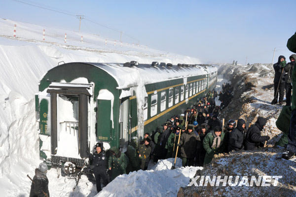 车体一点点地被积雪吞噬,抢险队员们刚刚抢通的线路眨眼间又被暴风雪掩埋。列车受困的位置恰好处在一个洼地处,暴风雪垒起的雪墙与车身之间只剩下了一条只能容下一人行走的小窄缝,宽度不断地在缩小。抢险队员只有采取单边接力,两头推进的方式,一点点扩大雪墙与车厢内旅客的距离。列车上的燃料逐步减少,随时面临停水、停电、停暖,1400余名旅客的生命安全受到了严重威胁。