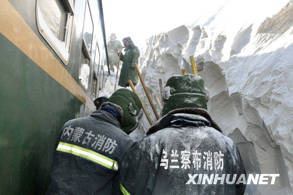 1月4日,消防战士在内蒙古商都受暴雪围困的旅客列车边除雪抢险。新华社发(田瑜 摄)