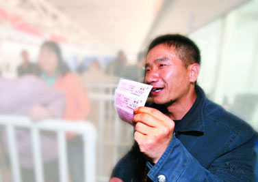 一名外来工开心地举着到手的3张火车票。火车票实行实名制,将有助改善春运“一票难求”的局面。信息时报记者 杜翠 摄