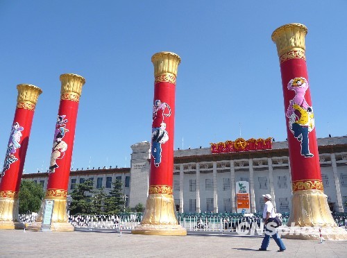 2009年9月15日,北京天安门广场,刚亮相的民族团结柱成为一道靓丽的风景,吸引了中外游客竟相拍照留影。 中新社发 玉龙 摄