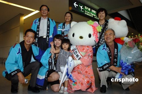 资料图:2009年7月8日,日本开放中国个人旅游签证后的首批自助游游客乘机抵达成田机场,受到日方的热烈欢迎。图为日本旅游观光大使kitty猫在机场迎接中国游客。 中新社发 朱沿华 摄