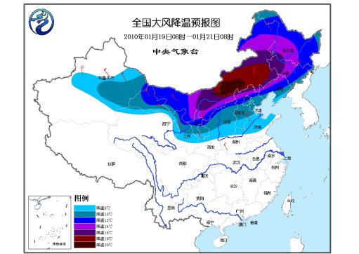 19日08时至21日08时,新疆东部和沿天山地区、西北地区东部、内蒙古、华北、东北、黄淮北部等地自西向东将先后有5~6级、阵风7~8级偏北风,新疆山口地区风力可达8~10级;上述地区的气温将下降8~12℃,其中,内蒙古中东部、东北地区西部的部分地区温度降幅可达14~18℃,局部地区有18~20℃。20日早晨,阿勒泰地区的最低气温将下降到零下35至零下43℃。20日、21日早晨,内蒙古东北部的最低气温也将下降到零下30至零下35℃,局地达零下40℃。
