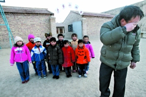 去年12月22日上午9点,甘肃省渭源县,代课老师苏汉伟在和自己所带的一年级10名学生照全家福时抹起了眼泪。他得知当地政府将在2009年年底前清退完所有的代课老师。杨登峰 摄