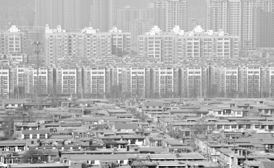 石家庄一个城中村与远处高楼相映衬,城中村由于租房价格低廉成为很多低收入家庭的聚居区,而楼房则是他们中很多人遥不可及的梦想。 新华社记者 巩志宏 摄