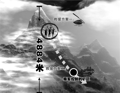 据了解,还有两个方式走出原始秘境。一是乘坐直升机,但每天如约而至的大暴雨根本没有适合直升机飞行的条件。二是穿过当地叛军控制的矿区。但这需要有过硬背景的探险公司与政府武装联合,乔装成矿工用军车乘夜间护送。途中还需要很大一笔费用来打点当地的武装分子,这样才能顺利通行。这些条件缺一不可,否则,很有可能被当地非政府武装扣押。7名队员一直认为这一路径十分冒险。但如果不能原路返回,穿越矿区就成为登山队员走出原始秘境的一条捷径。