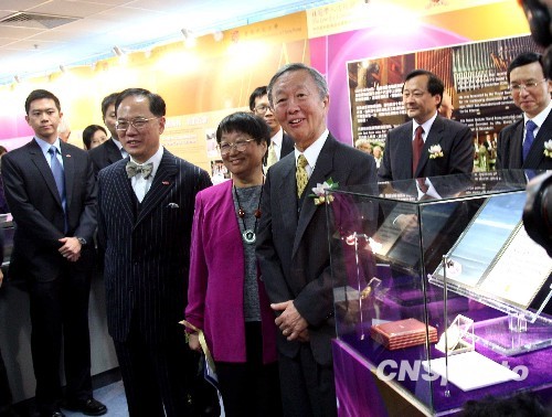 2月5日,香港中文大学举办的“高锟成就展”开幕,展品包括诺贝尔物理学奖得主、中大前校长高锟赠送的他历年获得的18个奖状、奖牌。图为特区行政长官曾荫权与高锟夫妇在物理学诺奖奖牌和证书前留影。 中新社发 洪少葵 摄