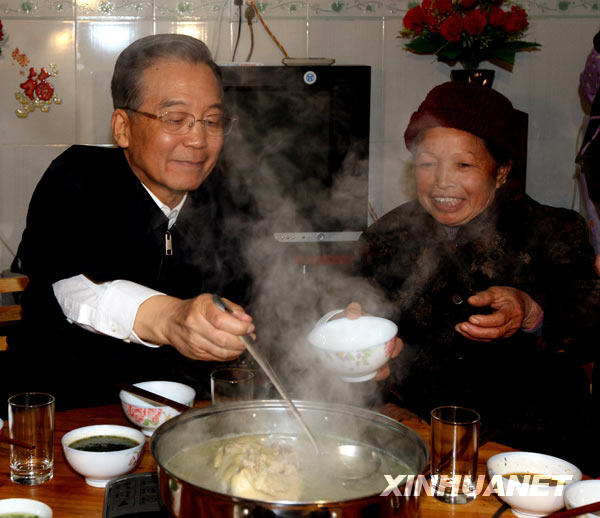 2月12日至14日,新春佳节到来之际,中共中央政治局常委、国务院总理温家宝来到广西壮族自治区河池、百色等地,看望慰问各族群众,共迎虎年春节。这是2月13日,温家宝在巴马瑶族自治县巴马镇练乡村村民蓝庆明家吃年夜饭。新华社记者姚大伟摄