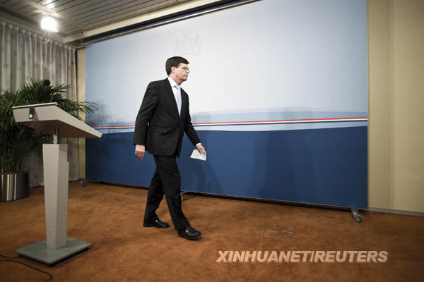 2月20日,荷兰首相巴尔克嫩德在海牙召开新闻发布会后离开。当日,巴尔克嫩德宣布,由于在阿富汗撤军问题上无法达成一致,执政联盟中第二大党工党将退出执政联盟,致使执政联盟解体。新华社/路透