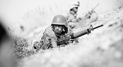 2月19日,在阿南部赫尔曼德省马尔贾地区,阿富汗士兵与美军士兵在一次军事行动中卧倒隐蔽。新华社发