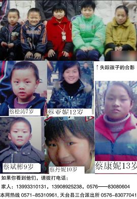 20日上午10点左右,有人给蔡修明的弟媳打来电话,说在三门县岭口见过5个孩子,可蔡家人到岭口未见孩子的踪影。这时,从岭口发往宁海桑洲的一位司机说看到过5个小孩乘中巴车已到宁海。蔡家亲戚赶往当地派出所调取了当时的监控录像,但录像比较模糊,不能确定那就是走失的蔡家姐弟。
