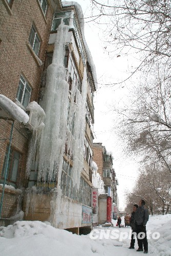 由于近期气温逐渐转暖,新疆阿勒泰市团结路的一户居民楼上出现“冰瀑”奇观,吸引路人驻足观看。据当地居民介绍,白天楼顶的雪融化很快,到了夜间气温降低,融化的雪水逐渐结成冰柱形成“冰瀑”,蔚为壮观。 中新社发 唐晓波 摄