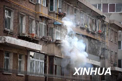 3月11日,公安民警向犯罪嫌疑人藏匿的房屋投掷催泪弹。新华社记者聂建江摄