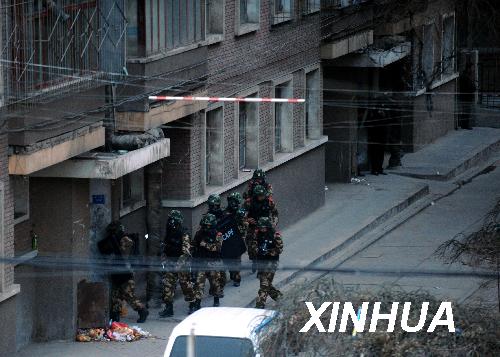 3月11日,武警进入犯罪嫌疑人藏匿的居民楼。当日晚,经过连续2天追捕,兰州“3·09”持枪袭警案犯罪嫌疑人在兰州市城关区一居民楼内被击毙。9日20时20分许,1名歹徒在接受调查过程中,开枪将兰州市公安局特警支队民警、二级警督窦勇击伤,随即逃逸。窦勇送甘肃省人民医院抢救无效牺牲。对这名歹徒的追捕随即展开。新华社记者聂建江摄