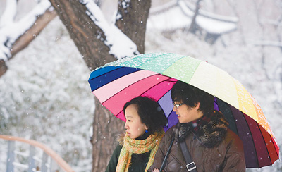3月14日,北京飘起雪花,一对情侣在雪中散步。吴家翔摄 (人民图片)