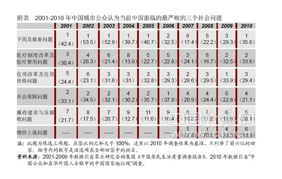 调查显示,公众认为当前中国面临的最严峻的三个社会问题中,下岗就业、医疗改革和住房改革排在前三位,占比分别为35.6%、33.6%和29.4%。