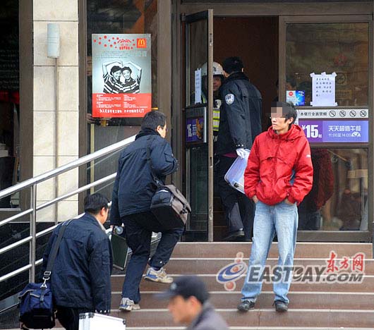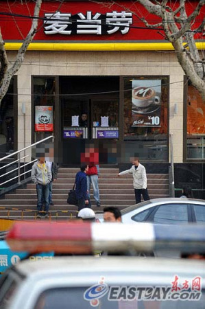 几名麦当劳员工在门口把守,谢绝顾客前来用餐。而马路对面则停着两辆警车。