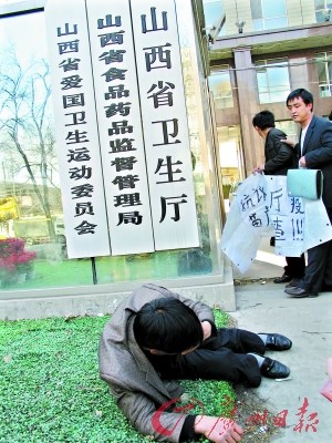 僵持半个多小时后,一名自称山西省卫生厅应急办的工作人员将他们带进办公大楼,在会议室等相关领导。不过,这些家长等了一个半小时,卫生厅相关领导都没有露面。