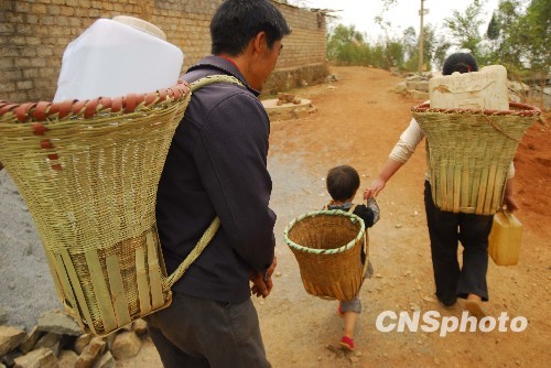 云南干旱灾情持续,截至3月18日,旱情已造成全省16个州市2405万人受灾,有811万人、539万头大牲畜饮水出现困难,农作物受灾面积达4668万亩。图为从3公里之外的取水点背水回家的一家三口。 中新社发 田洪 摄