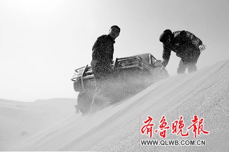 24日,在开往沙漠深处的路上,车轮陷入沙里,挖沙是沙漠司机的家常便饭。本报特派记者张中摄