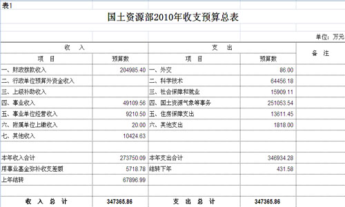 公告显示,今年,国土资源部收入及支出总预算为347365.86万元,其中,中央财政拨款204985.40万元,事业收入49109.56万元。另外收入中还包括了事业单位经营收入、附属单位上缴收入、其他收入以及用事业基金弥补收支差额和上年结转等。