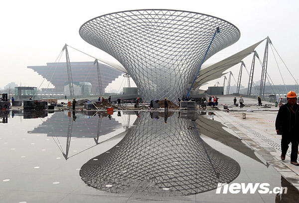3月31日,工人正在世博轴前的庆典广场施工。4月1日,上海世博会将迎来开幕倒计时30天,目前,世博园区内各项建设已进入尾声,近万名工人正加班加点,确保4月下旬世博园区如期投入试运营。新华社记者 任珑摄