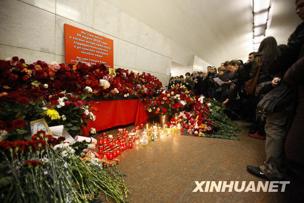 3月30日,在俄罗斯首都莫斯科曾发生爆炸的卢比扬卡地铁站内,一些市民为地铁爆炸案的遇难者默哀。当日为莫斯科哀悼日,许多莫斯科市民前往事发地铁站献花、默哀,悼念死难者。莫斯科时间3月29日上午,位于莫斯科市中心的卢比扬卡地铁站和文化公园地铁站接连发生爆炸。据俄官方最新公布的数据,爆炸造成至少38人死亡、63人受伤。 新华社记者鲁金博摄