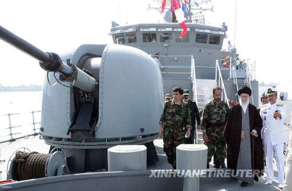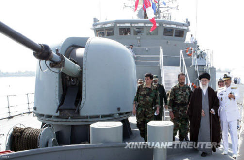 资料图片:2月19日,在伊朗南部城市阿巴斯港,伊朗最高领袖哈梅内伊(前右二)参加“贾马兰”号驱逐舰的下水仪式。新华社/路透