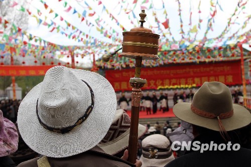 4月2日,西藏拉萨宗角禄康公园上演了一场精彩的非物质文化遗产展演。此次活动是西藏非物质文化遗产走进民间的重要尝试。展演节目集中在音乐舞蹈类,包括了昌果卓舞(腰鼓舞)、堆谐、芒康弦子、昌都锅庄、嘎尔鲁(宫廷乐舞)等,精彩的表演博得观众掌声不断。图为观众一边转经,一边看演出。 中新社发 徐长安 摄