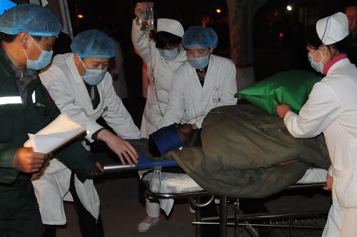 4月5日凌晨,一名获救工人被送到山西铝厂职工医院。当日凌晨,王家岭矿透水事故首批获救的9名工人被陆续送至山西铝厂职工医院接受检查和治疗。在9名获救工人中,有4人的生命体征平稳,意识清醒。医务人员正有条不紊地对获救工人进行治疗。新华社记者 吕晓宇 摄