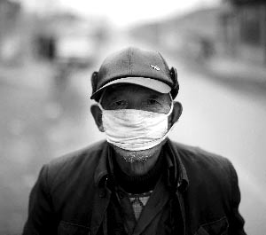2010年3月31日,内蒙古乌兰察布市兴和县店子镇,村庄里生病的老人戴着口罩在村中慢走,白色的口罩上留着黄色沙土的痕迹。