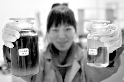 青海洁神环境能源产业有限公司工作人员在对比“地沟油”(左)和由餐厨垃圾处理而成的生物柴油。新华社记者 张宏祥 摄