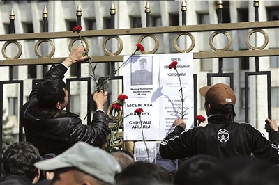 9日,比什凯克民众在总统府的栅栏上插上鲜花,悼念死难者。图/人民图片