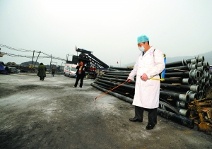 昨日,一名医务人员正在王家岭煤矿井口附近喷洒消毒药水。当日,事故遇难人数上升至33人。新华社记者燕雁摄