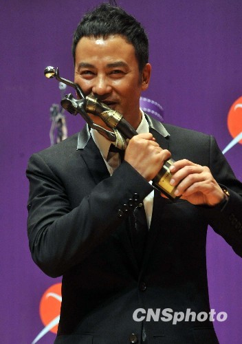 4月18日晚,“第二十九届香港电影金像奖”颁奖典礼在香港文化中心大剧院隆重举行,影星任达华凭演出电影「岁月神偷」夺得最佳男主角奖项。图为任达华亲吻最佳男主角奖项。 中新社发 邓庆乐 摄