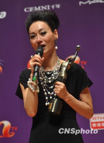 4月18日晚,“第二十九届香港电影金像奖”颁奖典礼在香港文化中心大剧院隆重举行,影星惠英红凭演出电影夺得最佳女主角奖“心魔”项。图为惠英红手持奖座向媒体畅谈感受。 中新社发 邓庆乐 摄