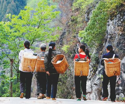冷洞村村民背着盛水工具准备取水浇灌金银花。