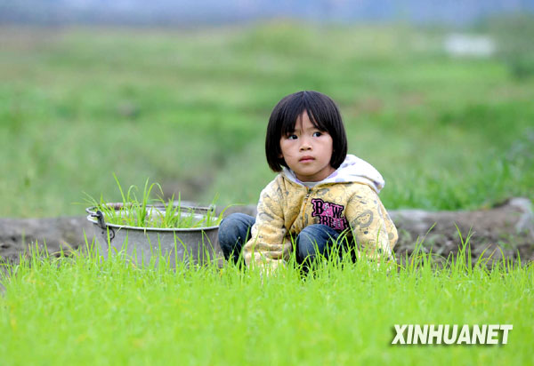 4月4日,在大化瑶族自治县都阳镇都阳村,6岁的黄丹丹在田间准备秧苗。连日来,广西大化瑶族自治县持续阴雨天气,旱区群众抓住难得有利时机,积极展开春耕春种活动,田野里到处是一派繁忙的景象。 新华社记者黄孝邦摄