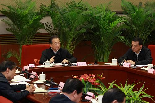 4月22日,中共中央政治局常委、国务院总理、国家能源委员会主任温家宝在北京主持召开国家能源委员会第一次全体会议,听取能源委办公室关于当前能源形势与工作任务的汇报。中共中央政治局常委、国务院副总理、国家能源委员会副主任李克强出席会议并讲话。新华社记者 庞兴雷 摄