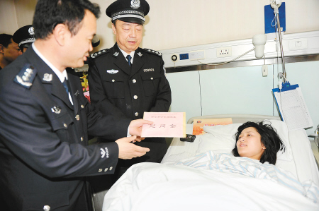 省公安厅厅长王锐及西安市公安局局长杜航伟看望受伤女交警张昂。翟小雪 摄