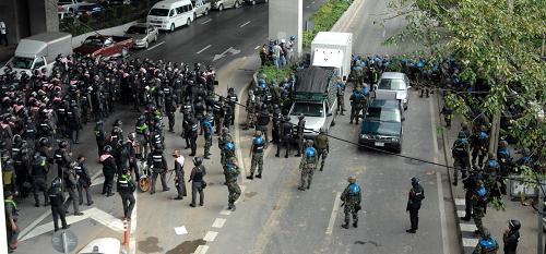 为阻止“红衫军”北上,泰国士兵鸣枪示警,并向示威者发射催泪瓦斯。双方冲突致死1名士兵,另有18人受伤。