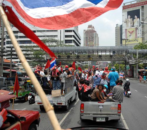 美联社报道,“红衫军”持续数周的示威游行致曼谷几大商业区几近陷入“瘫痪”,而“红衫军”28日宣布将扩大示威范围。28日下午,约1000名“红衫军”成员驾驶摩托车与皮卡车沿曼谷廊曼机场亚洲一号高速公路向曼谷北郊挺进。