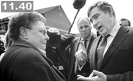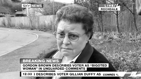 布朗当天前往英格兰西北部罗奇代尔与选民见面,在人群和媒体重重包围下与吉莉恩·达菲交谈大约5分钟。