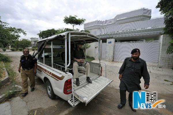 5月5日,在巴基斯坦白沙瓦,警察站在巴裔美国公民费萨尔·沙赫扎德的住所门前。巴基斯坦媒体当天报道,巴警方和安全部门4日抓获多名嫌疑人,他们是美国纽约时报广场未遂汽车炸弹袭击嫌犯费萨尔·沙赫扎德的亲友。新华社/法新