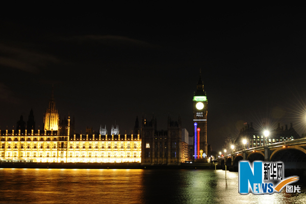 5月6日晚,在英国首都伦敦,大选投票出口民调数据投射在议会大厦的大本钟上。英国大选投票于当天晚上10点结束,进入计票阶段。英国三家主要电视台当晚宣布,投票站出口民调显示,英国三大政党在当天举行的大选投票中均未赢得多数议席,英国将出现1974年以来的首个“无多数议会”。新华社记者曾毅摄