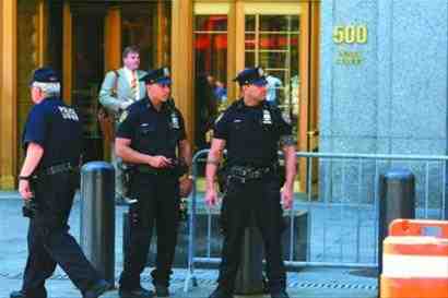 5月4日,警察站在曼哈顿纽约南区联邦法院外,为沙赫扎德接受庭审做准备 新华社发