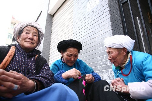 汶川地震两周年临近之际,在四川地震重灾区,新修住房、城镇巷子、老龄活动中心及景观大道都已修建完毕。图为汶川街道旁几位老人闲聊,闲暇之时老人仍不忘绣”羌绣”。 中新社发 张浪 摄