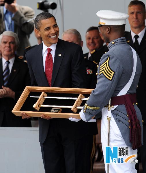 5月22日,在美国纽约州北部哈德逊河西岸西点镇的西点军校举行的2010年度毕业典礼上,美国总统奥巴马(左)接受学员代表赠送的礼物。新华社记者申宏摄