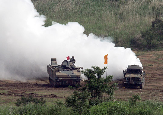 资料图片 2009年6月4日,韩国海军陆战队在韩国龙平岛举行大规模军事演习。