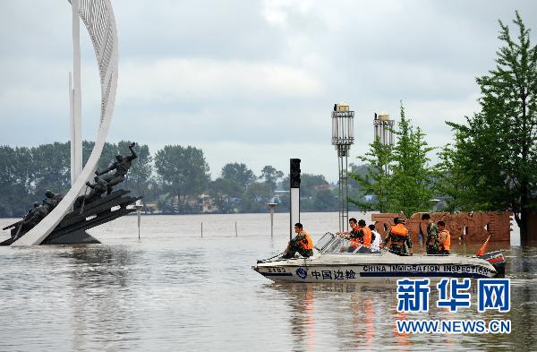 8月21日,丹东边防支队官兵乘快艇沿鸭绿江组织救援。受暴雨影响,丹东部分地区受灾严重,出现电力、通信中断,房屋倒塌,人员被困和失踪等灾情。截至8月21日7时,全市共有35个乡镇受灾严重,多个乡镇电力、通讯中断,房屋倒塌230间。新华社记者 任勇 摄