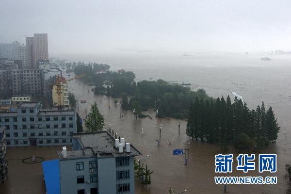 8月21日拍摄的鸭绿江丹东段江边。记者21日早上从丹东市防汛抗旱指挥部了解到,鸭绿江丹东段发生特大洪水,每秒流量超过2万立方米,多处堤防公路冲毁,部分县市交通、通讯、电力中断。新华社发(赵贵梁摄)